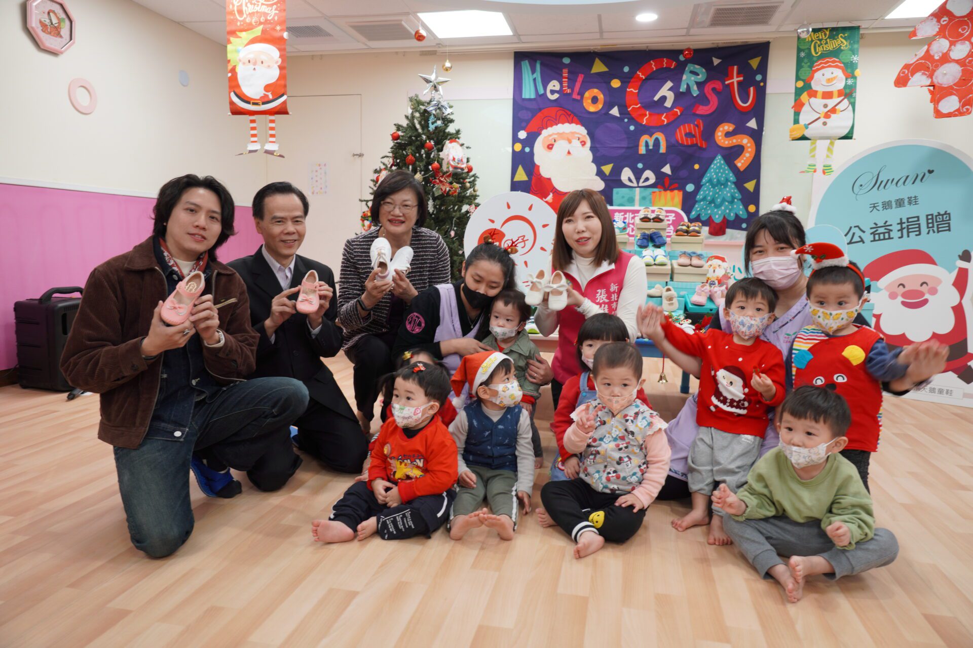 兒童都夢想在聖誕節收到聖誕老公公的禮物。,新北市議員張維倩媒合中和區在地製鞋廠商美萬新企業,今(21日)上午捐贈450雙天鵝童鞋,每雙鞋子都是師傅以針線一針一線縫製,外觀漂亮、鞋底防滑,美觀又好穿,讓收到這份禮物的南勢角公托中心小朋友非常開心。