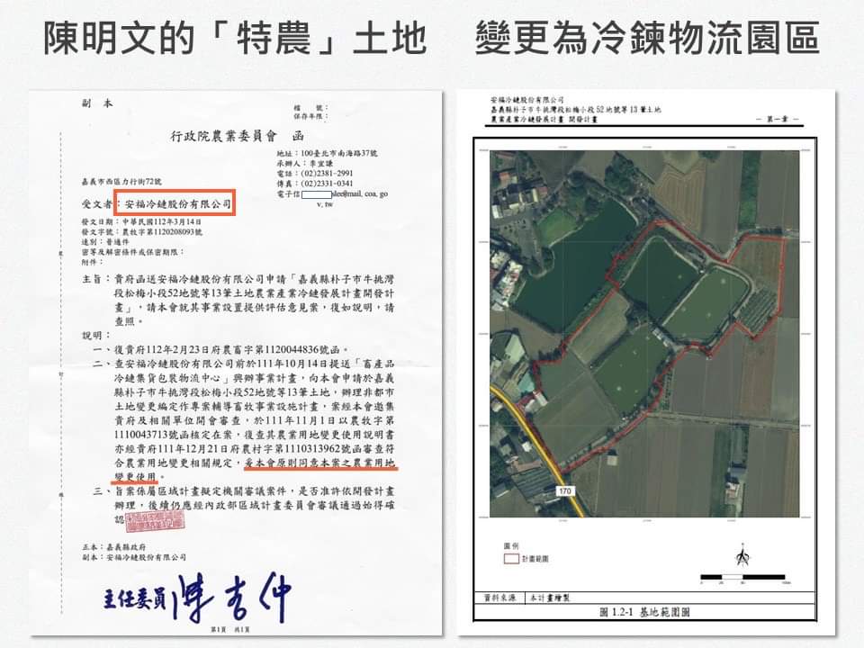 黃國昌表示,2021年蔡英文政府推出「百億冷鏈計畫」,陳明文馬上以妻子名義在2021年夏天成立「安福冷鏈」公司,收購嘉義朴子「特定農業區」的農牧用地,然後申請將3.9公頃的「特農用地」變更為「特定目的事業用地」,準備興建近萬坪廠房。