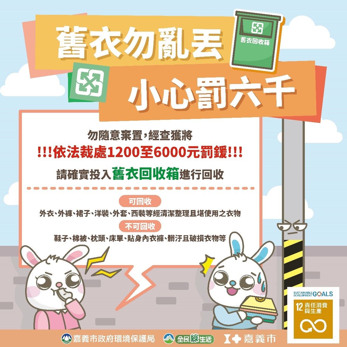 嘉義市政府環境保護局表示,為使民眾延續家中舊衣物回收再利用,於嘉義市轄內設置約150處,總計約200個舊衣回收箱 (舊衣回收箱放置點:https://is.gd/Kgp5Em),供民眾查詢回收舊衣站點。舊衣物回收時須注意,可回收的舊衣主要為經過清潔整理堪使用的舊衣,包含外衣、外褲、裙子、洋裝、背心、外套、西裝等;不可回收的包含鞋子、棉被、枕頭、床單、貼身內衣褲、髒汙破損衣物等,應以一般廢棄物打包丟棄於垃圾車,勿貪圖一時方便隨意丟棄,使舊衣回收箱周邊成為垃圾集中點,造成環境髒亂或影響交通等情事,違者經查獲將依廢棄物清理法第27條及第50條規定,裁處1,200至6,000元罰鍰,請民眾共同發揮公德心,勿心存僥倖,共同維護你我的環境。